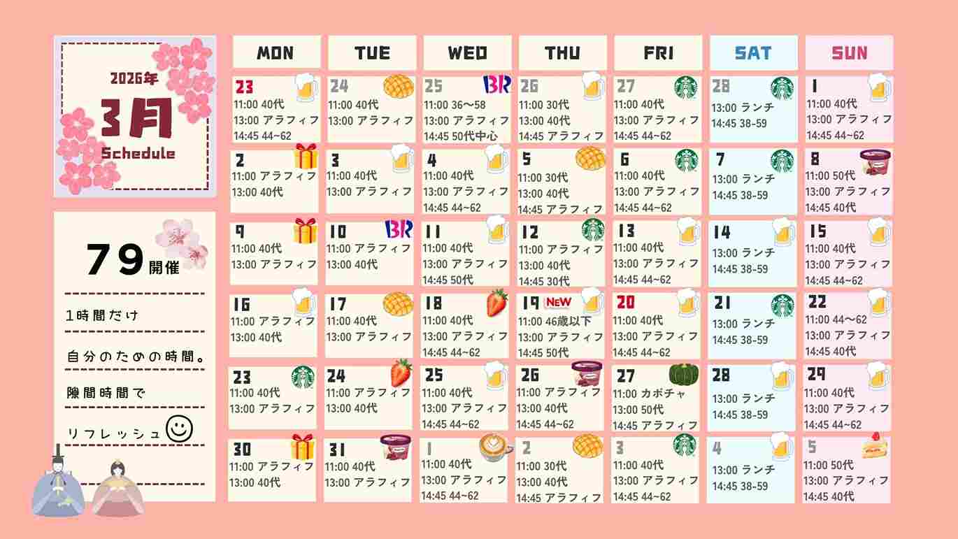 老舗既婚者合コンサークルとのコラボ企画/行列のできるスイーツ店企画などのSpecialPartyを、ふと昼間のあいた時間に曜日を問わずお楽しみいただけます。